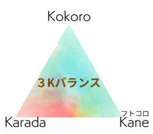 カラダKarada・ココロKokoro・フトコロKaneの3Kバランスが一つでも崩れると、なぜか他の部分もガタガタしてくることがあります。